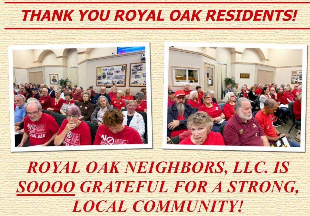 WOW – We are so proud of our Royal Oak Community for showing up at the Planning & Zoning meeting January 21! The latest count is approximately 130 Royal Oak residents – the downstairs lobby overflow area was full!! Your presence made a HUGE difference.